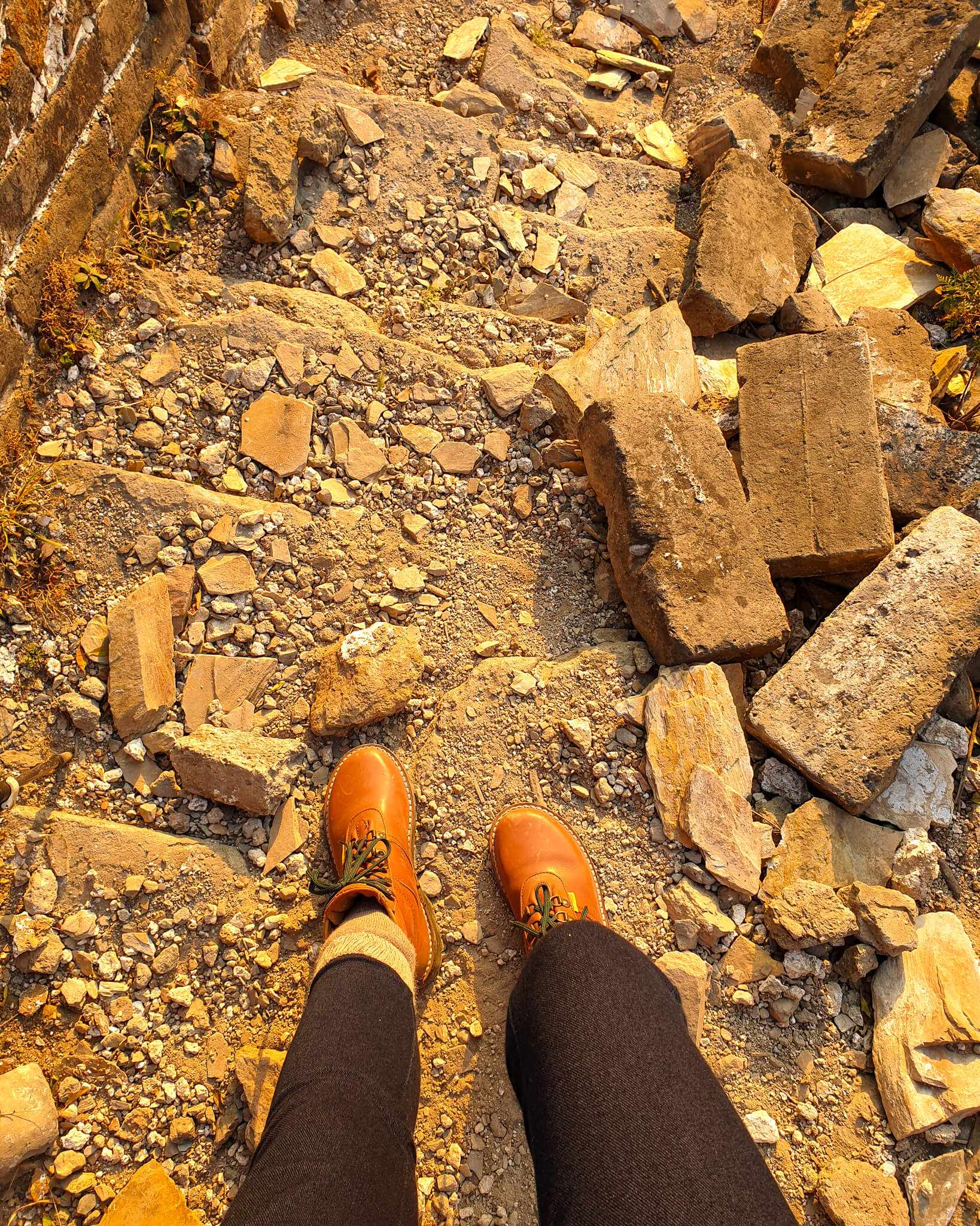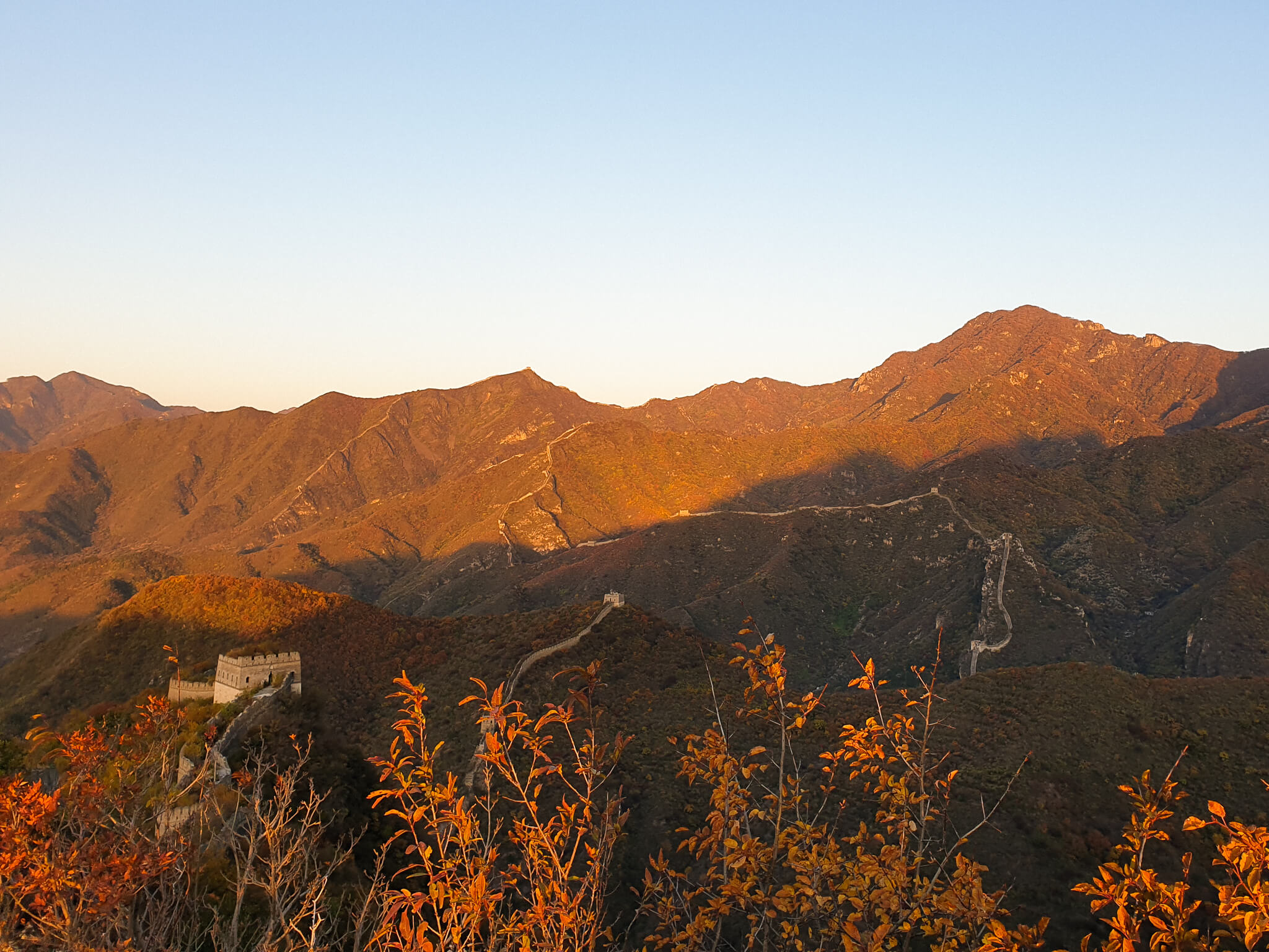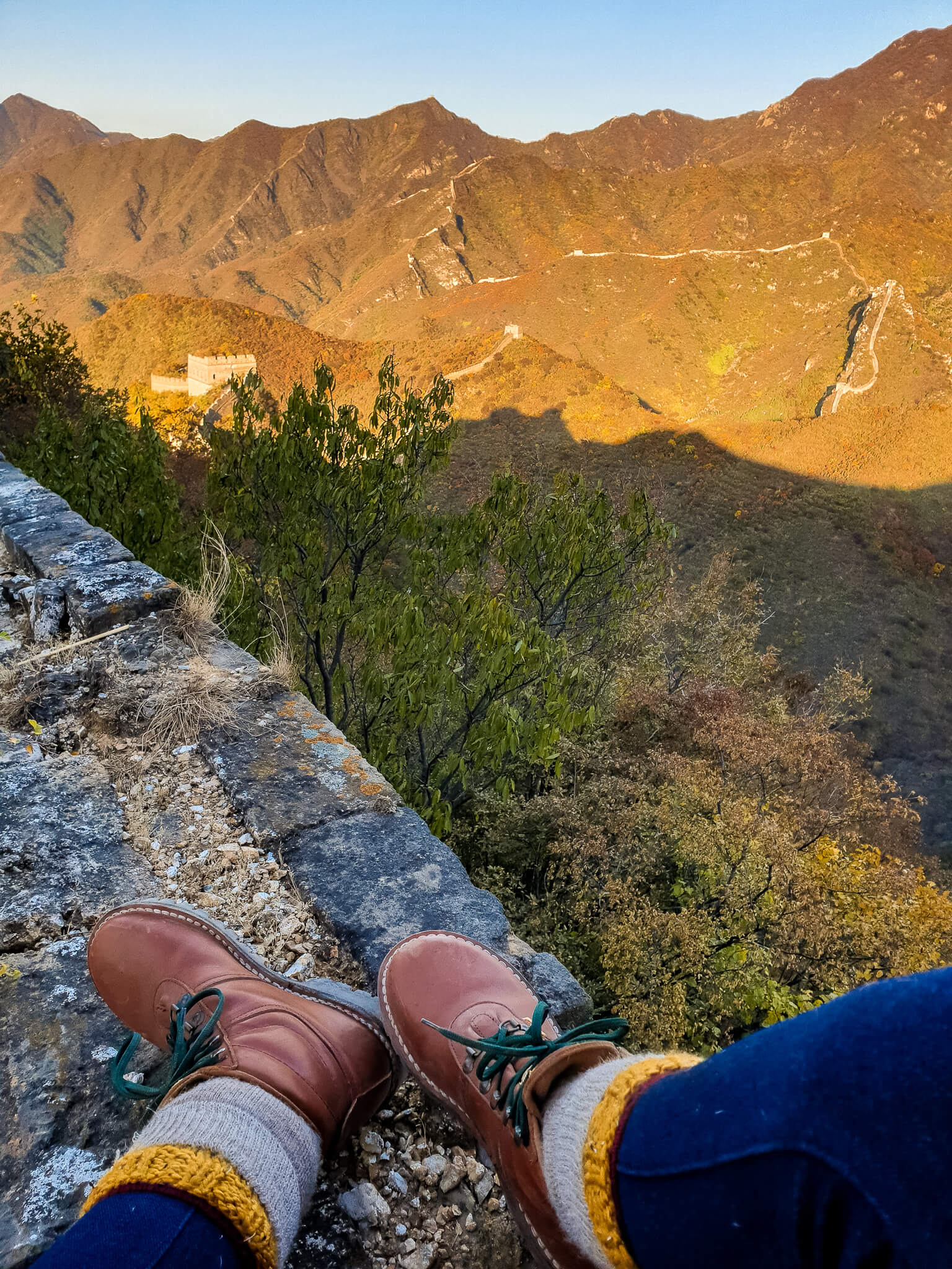 On one section of the wall, a mini forest of colour-changing trees, ever so often rustling in the breeze. A few small inscriptions on the wall, wondering what they mean. Maybe the craftsmen or those in charge of that area when it was built. Other parts, you can see how time and weather have played a role in the wall’s deterioration. Rain being the biggest culprit. As the sun started lowering over the rolling hills, we made it to our final location for the day.