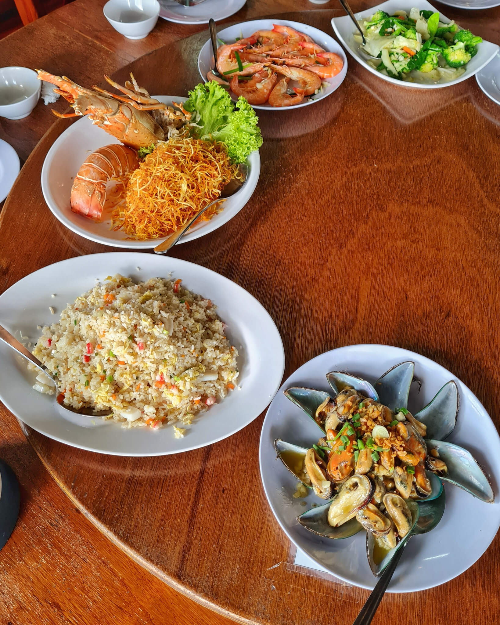 First, to arrive, a beautiful platter of steamed prawns, followed by rice, enormous mussels cooked with garlic and greens. A beautiful crayfish, a Singapore classic and their signature Chilli Crab with ManTou and lastly, our lovely self caught fish.