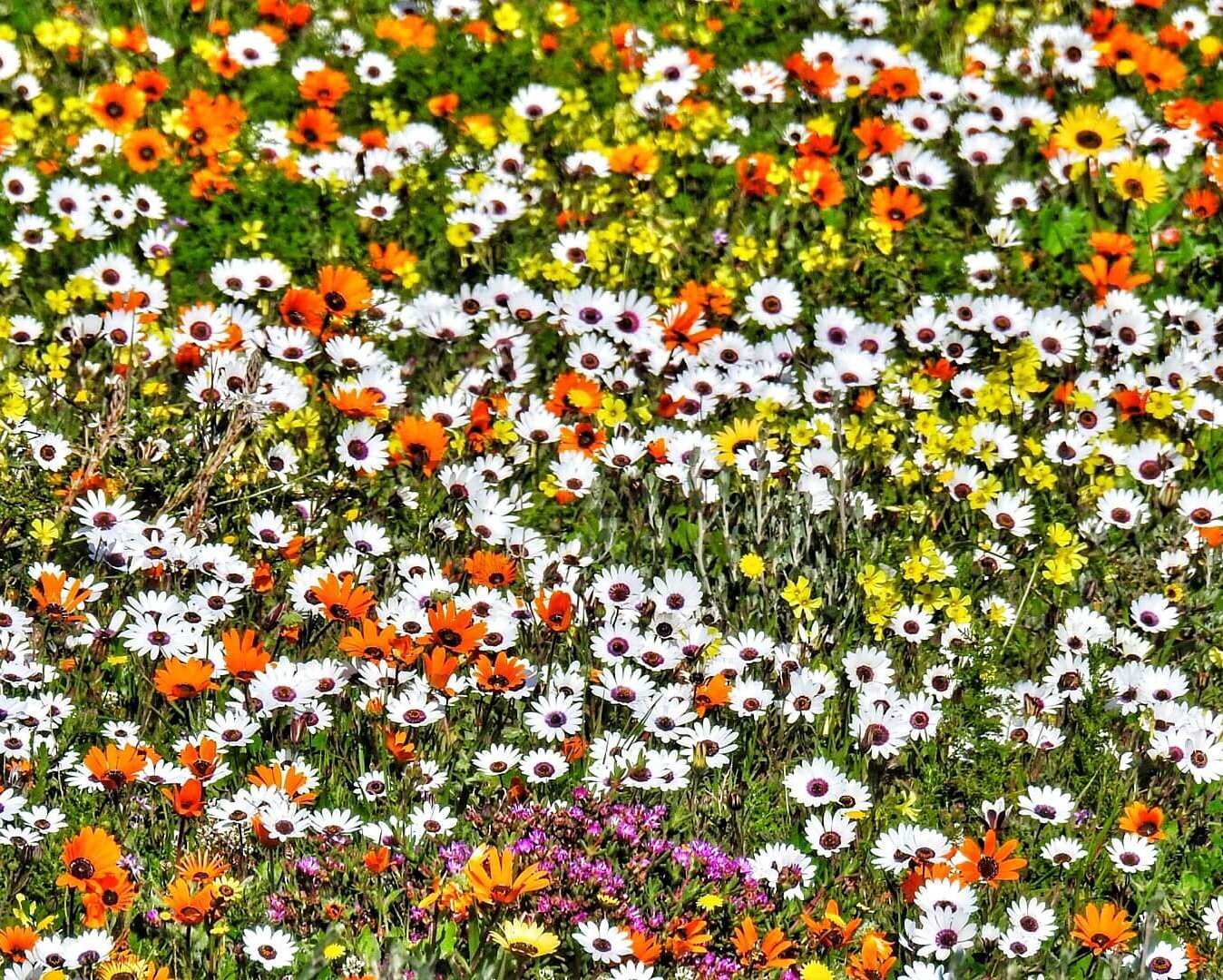 The well known yellow Gousblom (Arctotis hirsuta), the pink Bokbaai vygie (Dorotheanthus bellidiformis) and White rain daisy (Dimorphotheca pluvialis). And in Postberg the Magriet (Ursinia anthemoides) and delicate blue Sporrie (Heliophila coronopifolia), and Pietsnotjies (Grielum humifusum).